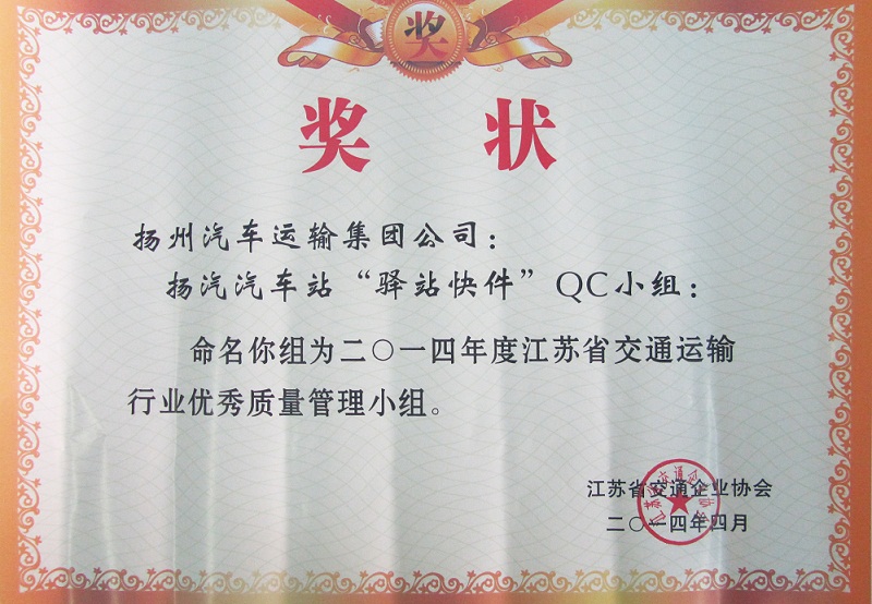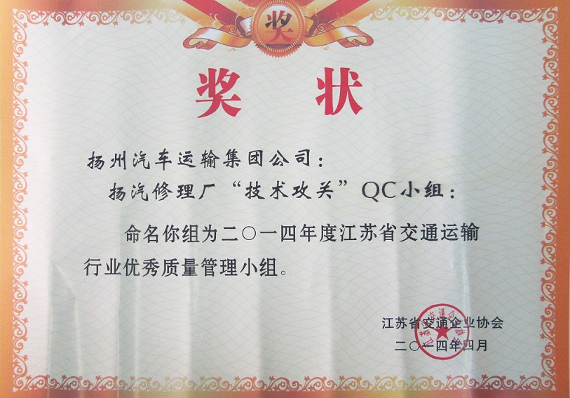 又訊:在此前進(jìn)行的江蘇省交通運(yùn)輸行業(yè)優(yōu)秀QC小組成果評(píng)選中,集團(tuán)公司被表彰為“省交通運(yùn)輸行業(yè)質(zhì)量管理小組活動(dòng)優(yōu)秀企業(yè)”,揚(yáng)州汽車站“驛站快件”QC小組(成果《降低到達(dá)庫收發(fā)貨的誤差率》)與修理廠“技術(shù)攻關(guān)”QC小組(成果《汽車變速箱小車式托架的研制》)被評(píng)為“省交通運(yùn)輸行業(yè)優(yōu)秀質(zhì)量管理小組”。