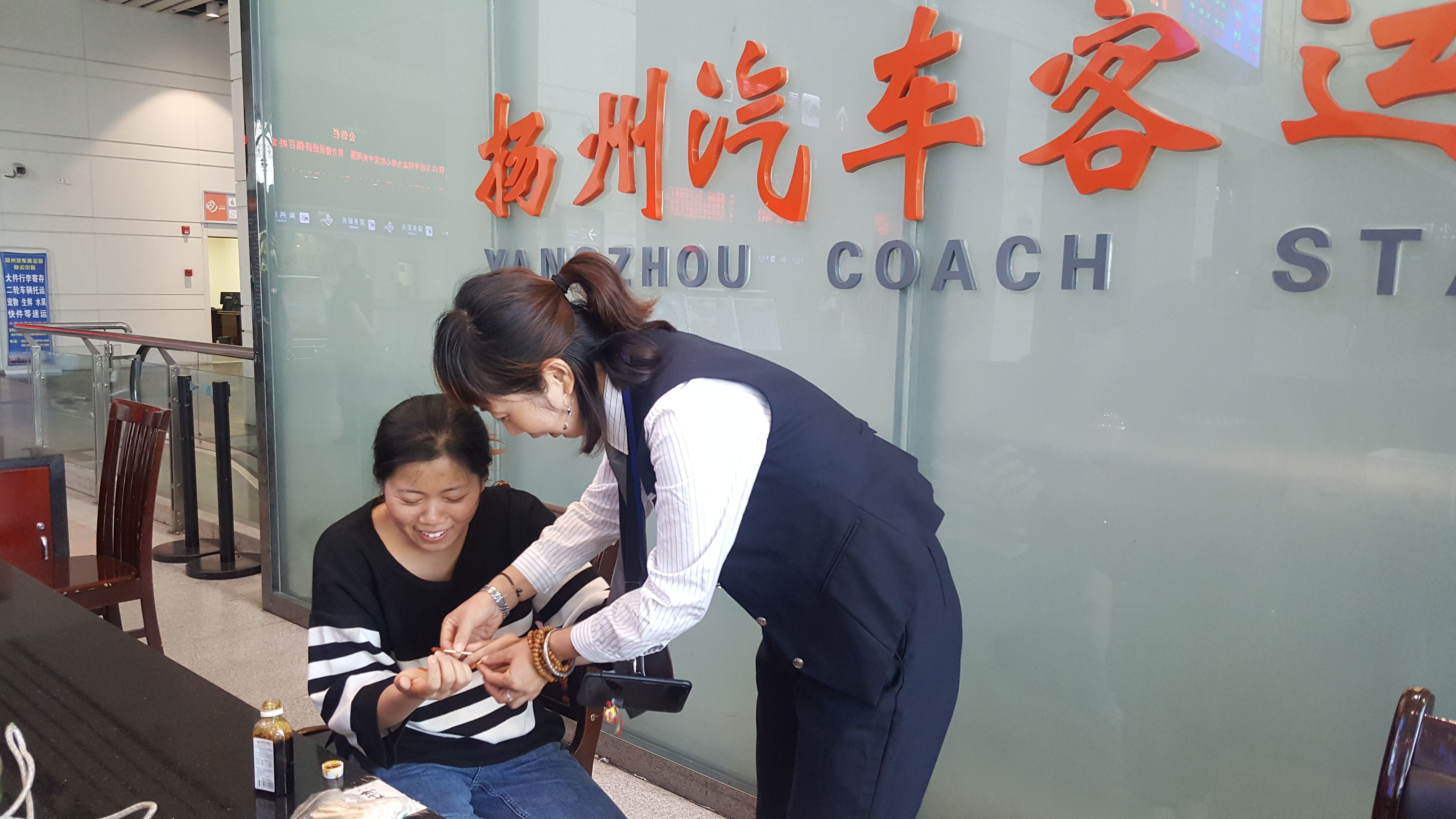 今天(10月11日)下午3時許,揚州西部客運樞紐售票大廳門口,一位年輕女子背著行李,一瘸一拐痛苦地邁進了汽車站售票大廳,見此情形,眼尖心細的服務(wù)班工作人員殷俊,迅速跑上前去,攙扶著該女士坐下。
