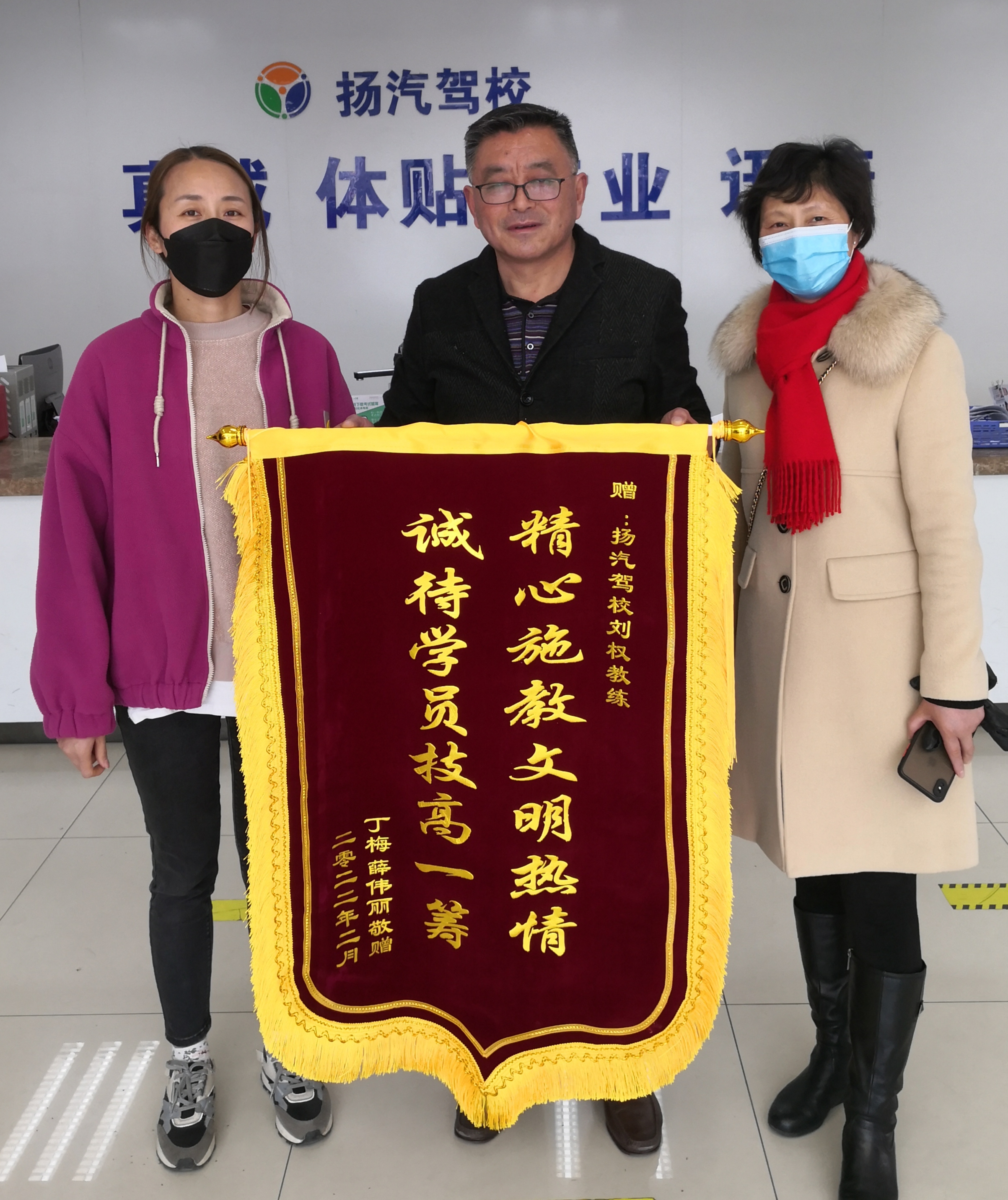 3月1日下午,揚(yáng)汽駕校又收到一份禮物,剛剛順利領(lǐng)取駕駛證的學(xué)員丁梅、薛偉麗,將“精心施教、文明熱情、誠待學(xué)員、技高一籌”的錦旗送至揚(yáng)汽駕校招生大廳,對教練劉權(quán)學(xué)車期間的辛勤付出表達(dá)深深的謝意以及對揚(yáng)汽駕校的肯定。