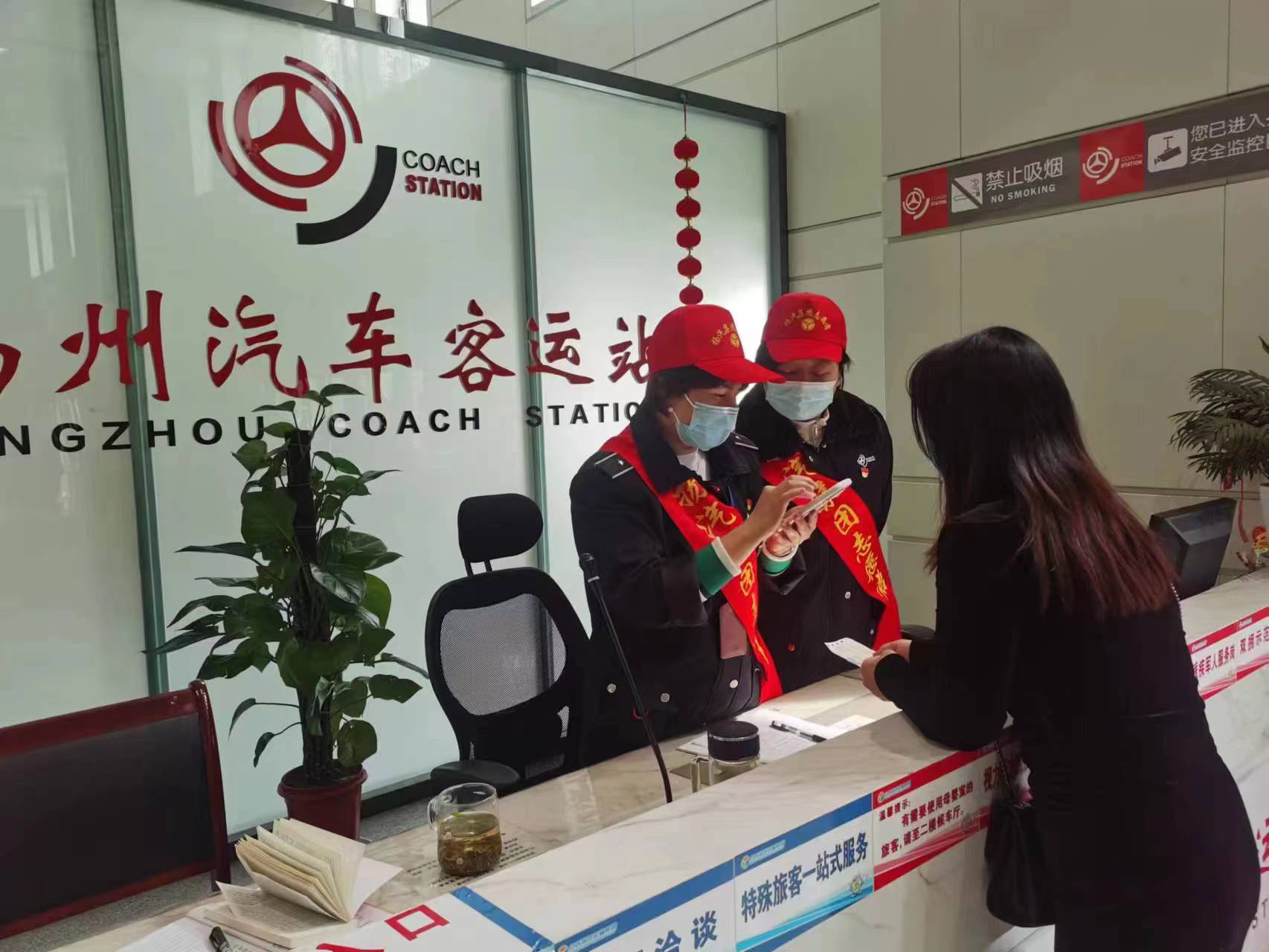 在江都汽車站,一位老奶奶就等在了車站門口拖著一個大大的尼龍袋子,服務臺的志愿者見狀趕緊上前詢問,原來老年人有急事去往南京,而且患有高血壓,一著急就頭暈,也不知道怎么購票,感覺早早來總不會錯,但看著現(xiàn)在車站這么多窗口和機器,一下子不知道應該怎么操作。工作人員一邊安慰老人,一邊幫老人在窗口買好了票,并幫助老人運送行李,和發(fā)車員妥善安排好了老人的上車問題,才放心地回到自己的工作崗位。